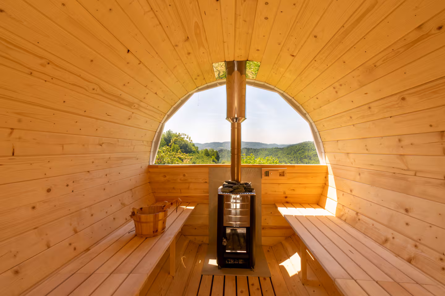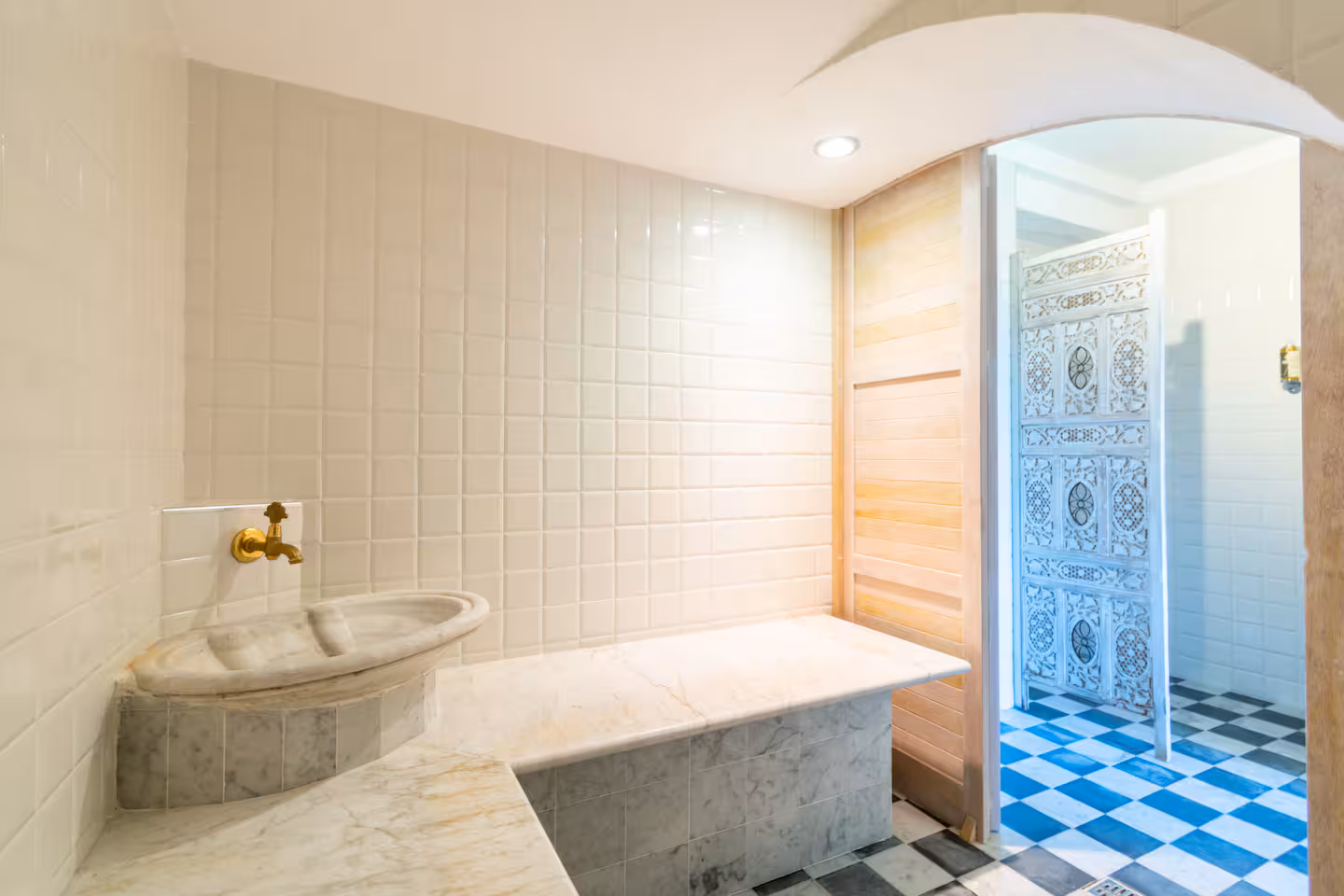 An exclusive spa suite with hot tub, Turkish bath, and outdoor sauna—ideal for unwinding and renewing body and spirit.